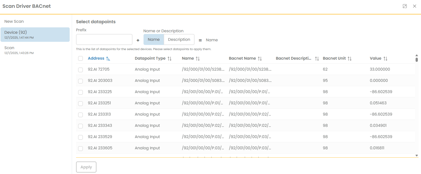 Das Ergebnis eines Gerätescans ist einer Liste von Datenpunkten. Alle ausgewählten Datenpunkte werden durch Bestätigung in die obere Liste der Datenpunktkonfiguration übernommen und können dann weiter verwendet werden.