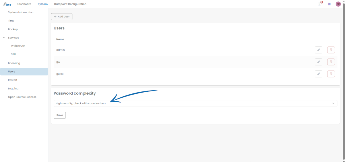 Die Einstellungen zur Passwortkomplexität können im Menüpunkt System/Users vorgenommen werden. Die entsprechenden Konfigurationsoptionen stehen ausschließlich Benutzern mit Administratorrechten zur Verfügung.
