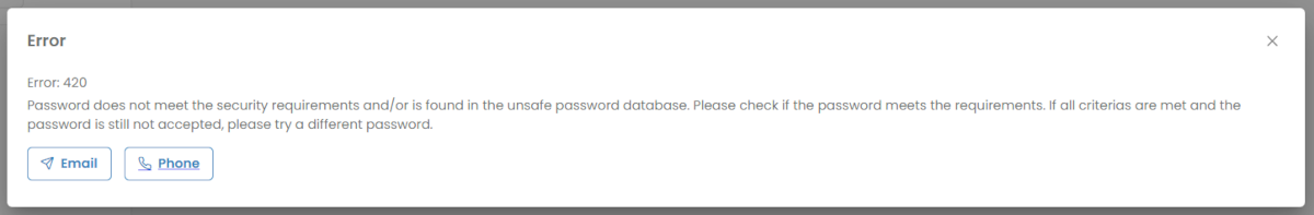 Zusätzlich zu diesen Regeln wird geprüft, ob die Komplexität des Passwortes hinreichend ist. Es kann deshalb vorkommen, dass trotz aller erfüllten Bedingungen das neue Passwort abgelehnt wird. Siehe Abb. 2. In diesem Fall den Hinweis durch das X oben rechts schließen und das neue Passwort überarbeiten.