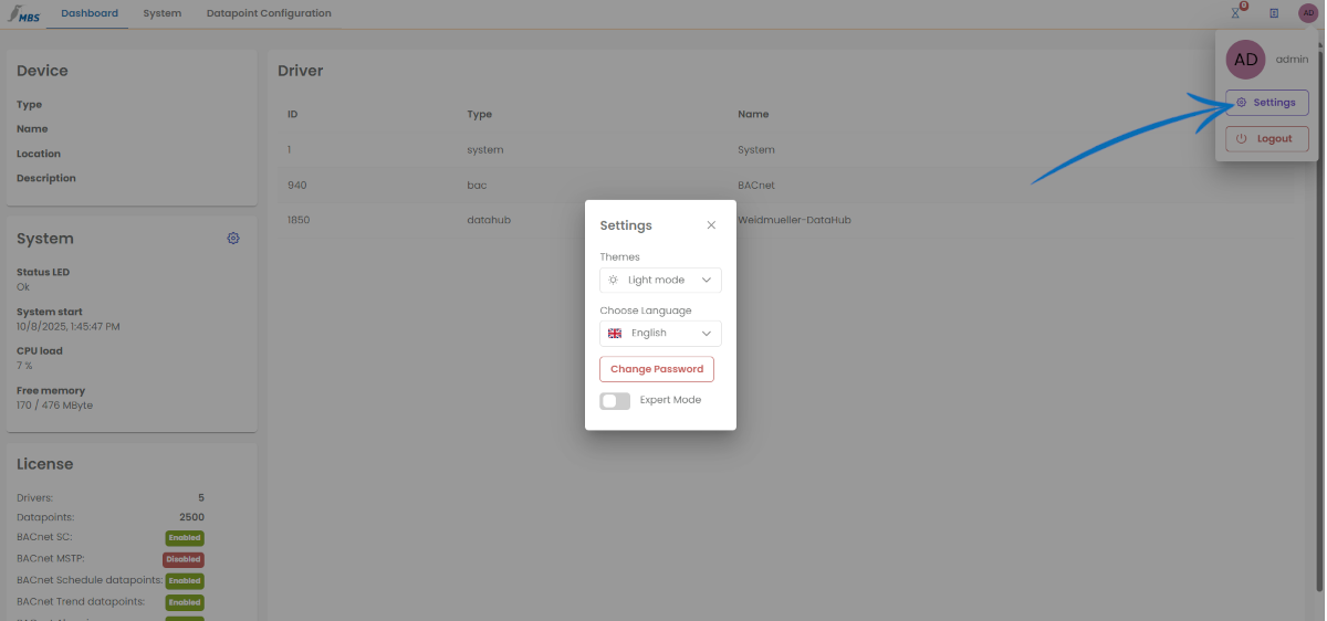 Durch Klick auf das Usericon/Settings öffnet sich ein kleiner Dialog in dem wiederum der Dialog zum Ändern des Passwortes über “Change Password” aufrufen werden kann. Siehe Abb. 1.
