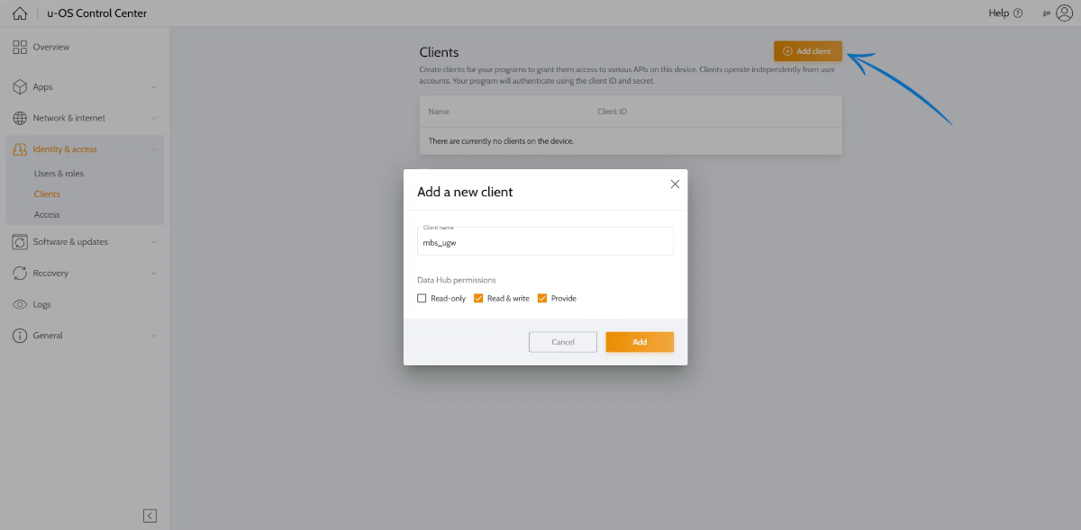 Über die Schaltfläche “Add client” wird der Dialog “Add a new client” aufgerufen. Hier ist zu beachten, dass der Client Name “mbs_ugw” exakt eingegeben wird. Die beiden Optionen “Read & write” sowie “Provide” sind zu wählen.