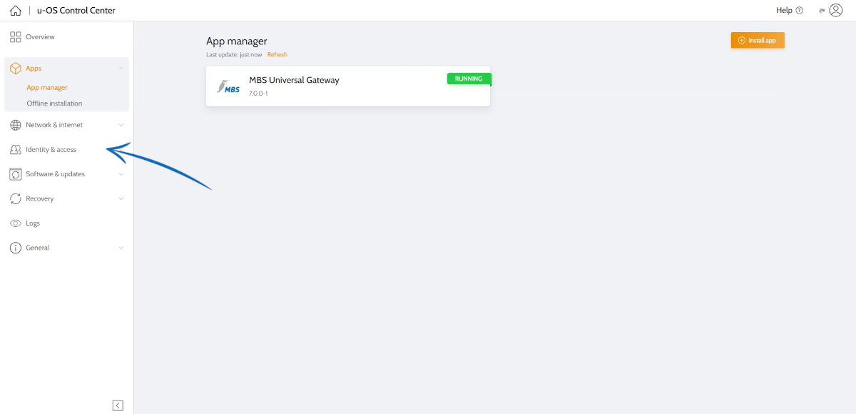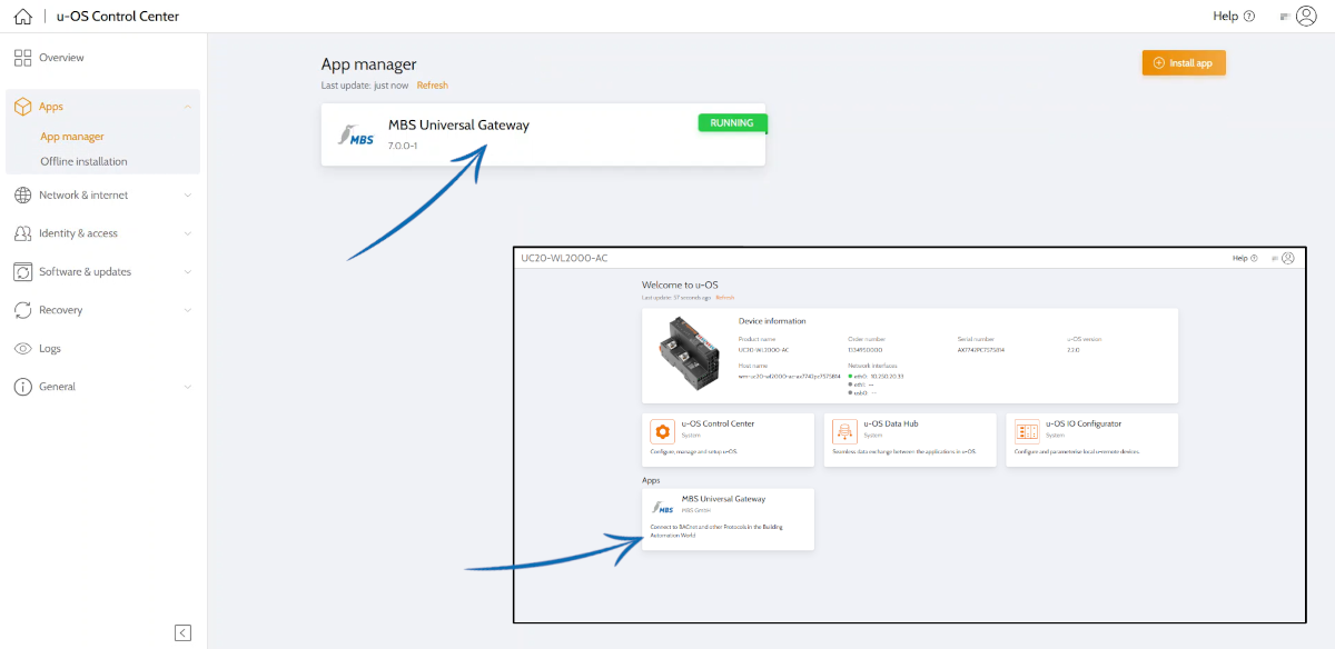 Sobald die MBS Universal Gateway App installiert und der Client eingerichtet ist, kann die MBS Universal Gateway App durch einen Mausklick ausgewählt werden. Entweder über den Menüpunkt Apps/App Manager oder direkt über die Startseite der Weidmülleroberfläche.