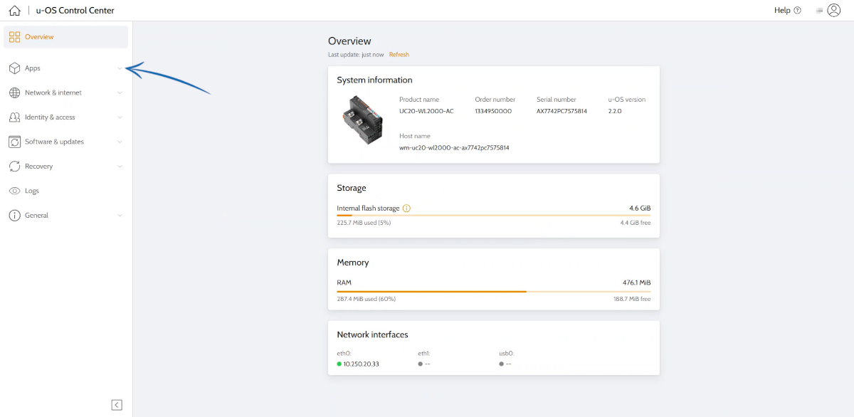 Nach erfolgreicher Anmeldung wird die Dashboard-Ansicht geöffnet. Zur Installation eines V-Gateway muss das „u-OS Control Center“ aufgerufen werden.