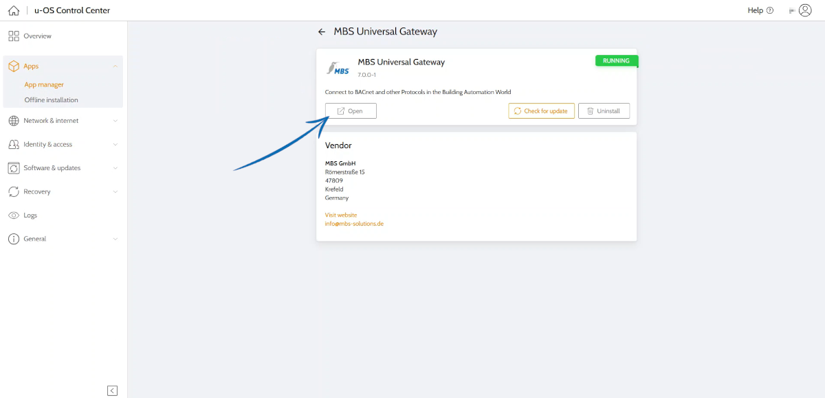 Die MBS Universal Gateway App wird mit Klick auf “Open” gestartet. Es öffnet sich ein neuer Tab im Browserfenster und die Loginseite des V-Gateways ist sichtbar.