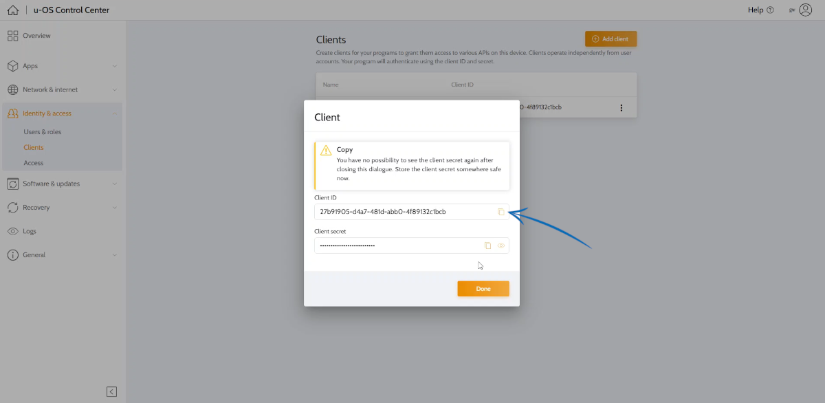 Nachdem der Client hinzugefügt wurde erscheint ein Dialog mit der Client ID und dem Client secret.