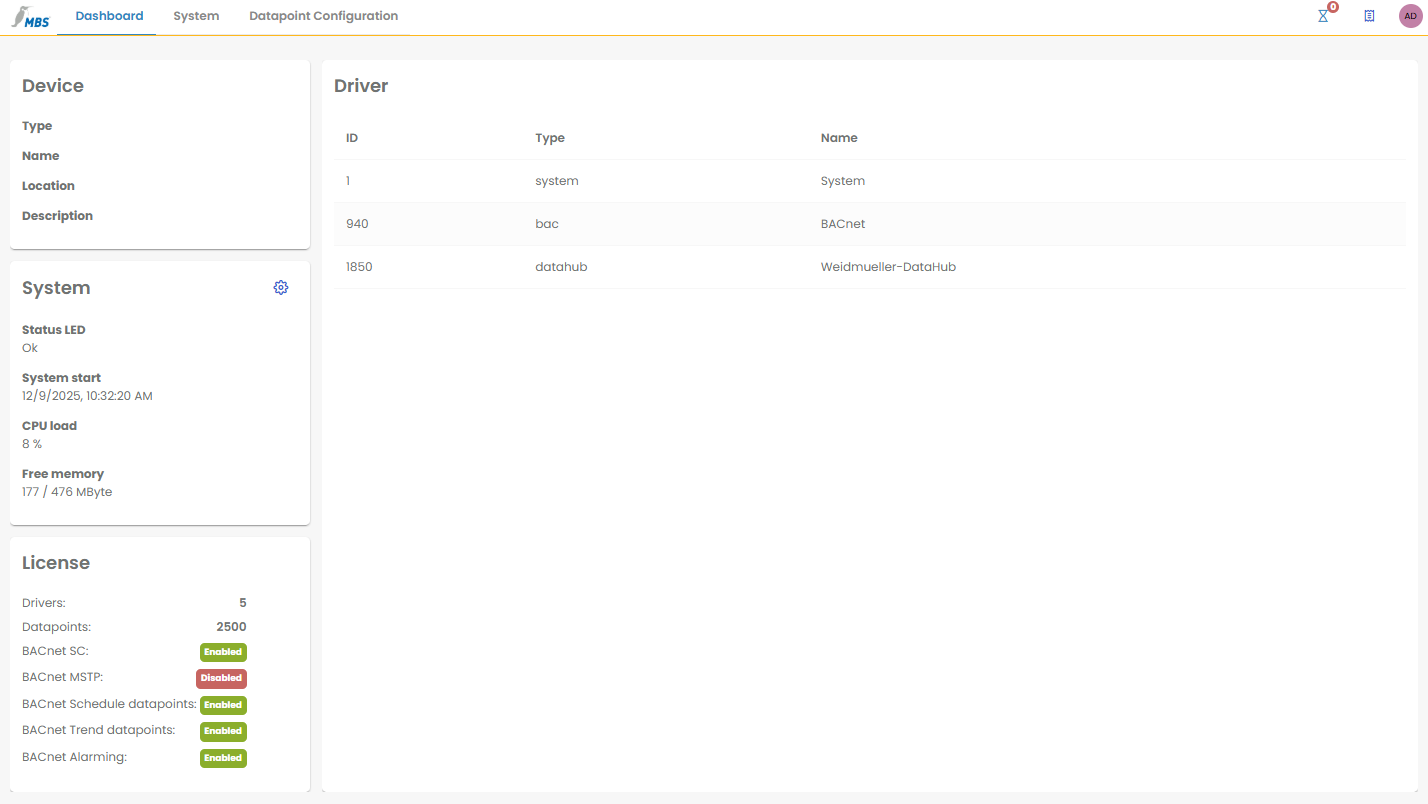 Das Dashboard dient als zentrale Startseite nach dem Login und bietet eine umfassende Übersicht zu den wichtigsten Systemkomponenten. Hier werden Geräte- und Systeminformationen angezeigt, ergänzt um eine detaillierte Auflistung der aktuell installierten Treiber sowie der hinterlegten Lizenzen.