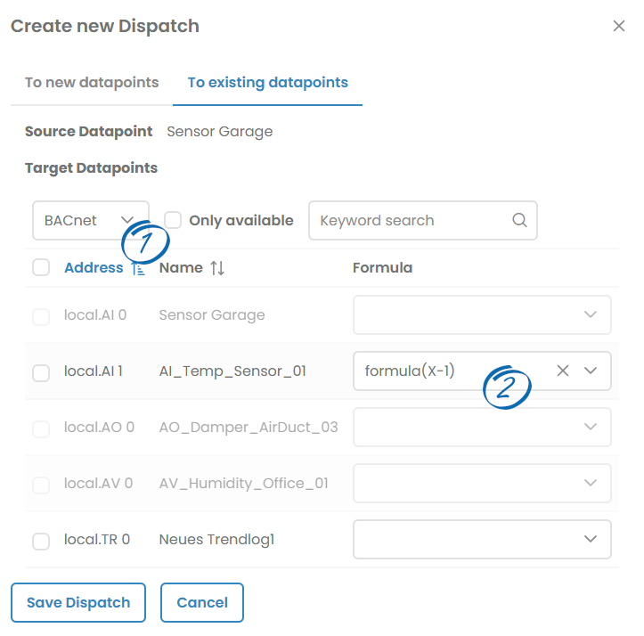 Ausgewählte Zieldatenpunkte können mit einer Formel ② versehen werden. Speichere Dispatch schließt den Dialog. Damit die Dispatches wirken können muss der Datenpunktmanager neu gestartet werden.