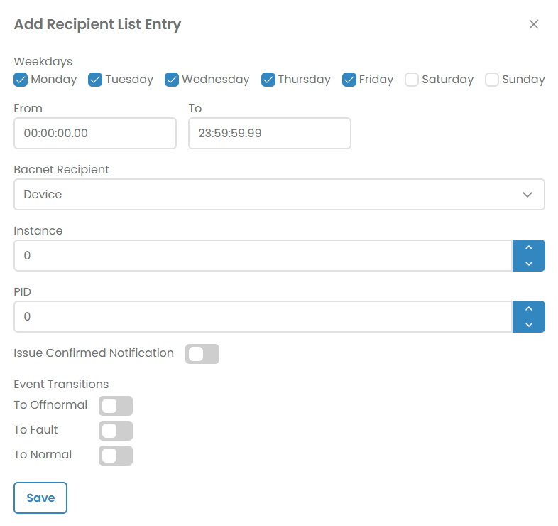 Es wird empfohlen die Empfängerliste über die “+” Schaltfläche anzulegen. Bei Aktivierung dieser Schaltfläche öffnet sich ein Dialog in dem angegeben werden kann, für welche Tage, welches Gerät und welche Prozess-ID die Notification wirkt. Hier können die Standardeinstellungen beibehalten werden.