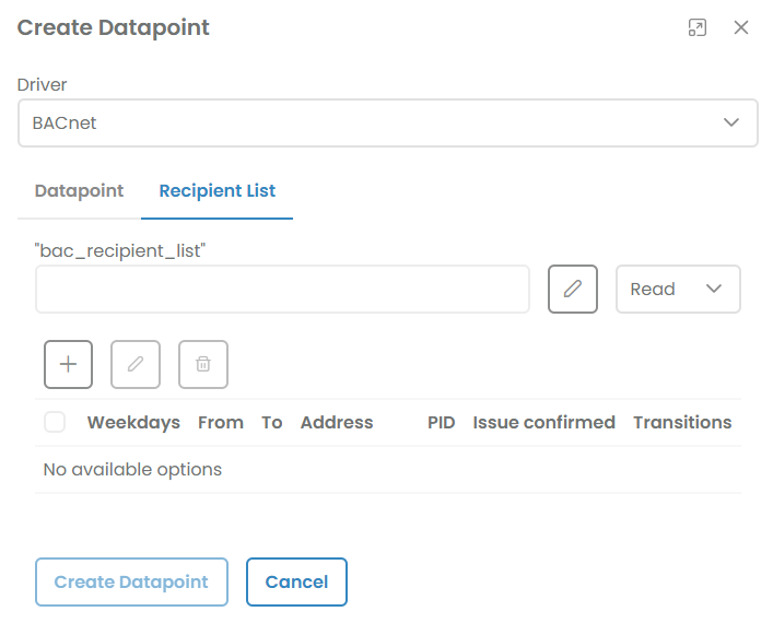 Der Dialog zur Konfiguration eines BACnet-Datenpunkts lässt sich sowohl über die Erstellung eines neuen Datenpunkts als auch durch die Bearbeitung eines bestehenden Datenpunkts aufrufen.