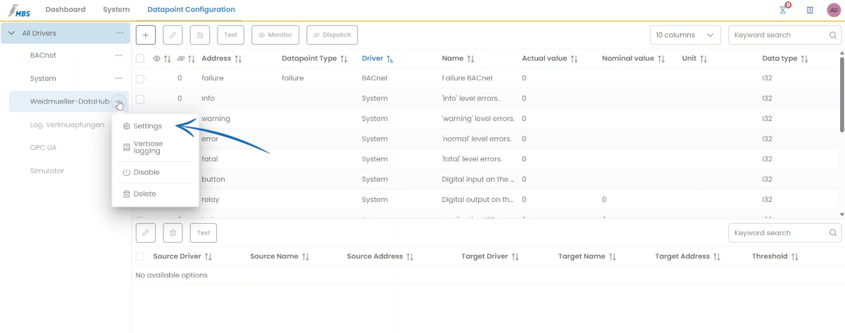 Dafür wird unter Datapoint Configuration/All Drivers/Weidmueller-DataHub/Settings der Konfigurations Dialog aufgerufen.