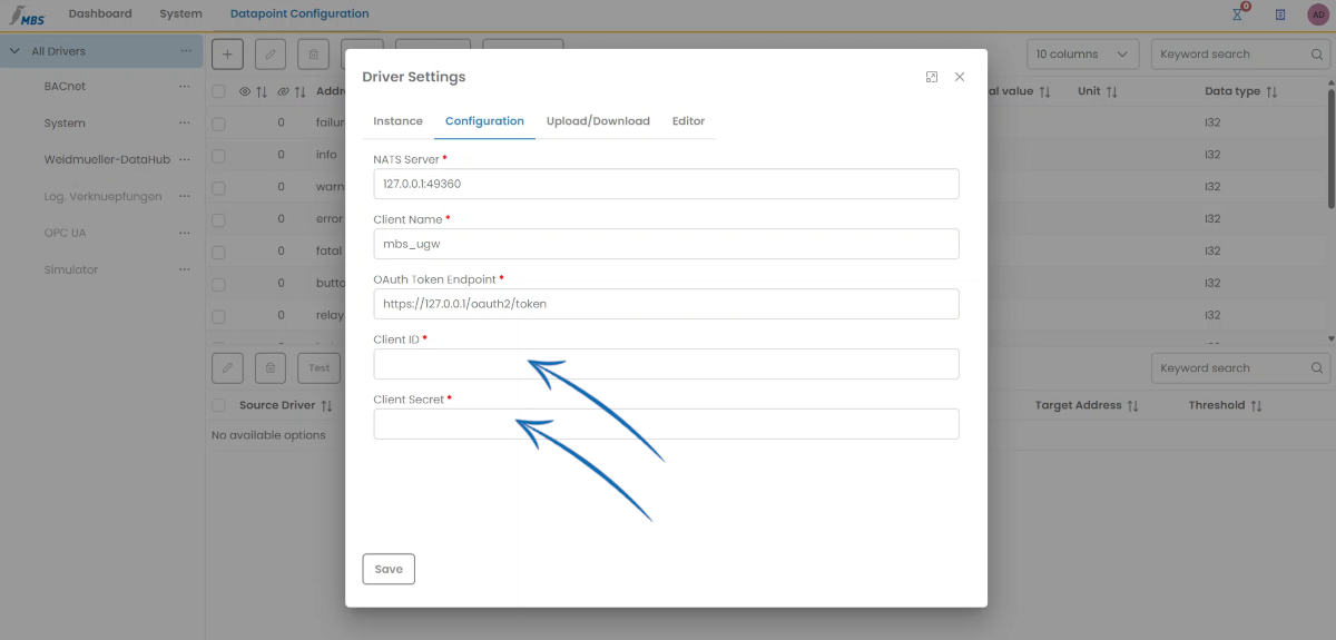 Im Dialog “Driver Settings” zu dem Tab “Configuration” wechseln und dort in den beiden Feldern Client ID und Client Secret die beiden hier zuvor notierten Daten einfügen.